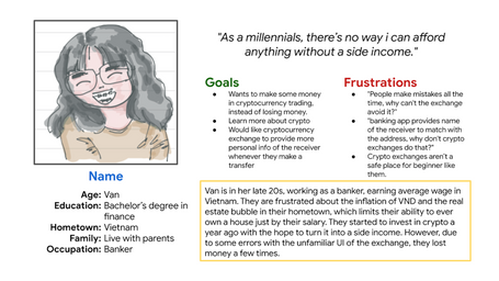 Van is a junior banker who needs crypto exchange to be more beginner-friendly because they do not want to lose their money accidentally through clicking the wrong button or so.